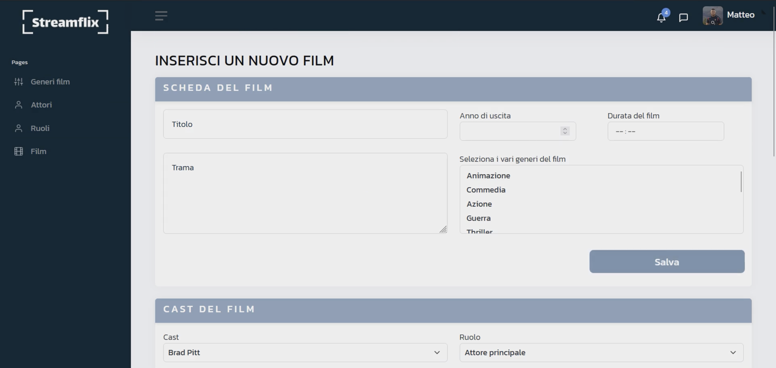 In aggiunta alla creazione del sito di streaming video, ho sviluppato integralmente la sezione relativa al login degli utenti, implementando metodi avanzati di sicurezza per garantire la protezione delle informazioni sensibili. Inoltre, ho dedicato particolare attenzione alla realizzazione delle diverse componenti della dashboard amministrativa. Quest’ultima consente agli amministratori di gestire i contenuti relativi ai film, fornendo loro strumenti intuitivi e funzionalità efficaci per l’inserimento, la modifica e la gestione delle informazioni.